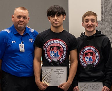 Temple High School sophomore David Maxson also qualified for this year’s state meet as an alternate in the 106-pound class. Maxson finished in fifth place at the Class 6A Region IV Meet. Both wrestlers were recognized at the TISD school board meeting on Monday (March 6).